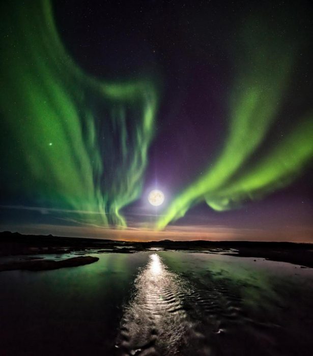 Keď nabité častice zasiahnú naše magnetické pole, ich žiaria sa mení na farebné pruhy, ktoré môžme vidieť skrz celú oblohu.