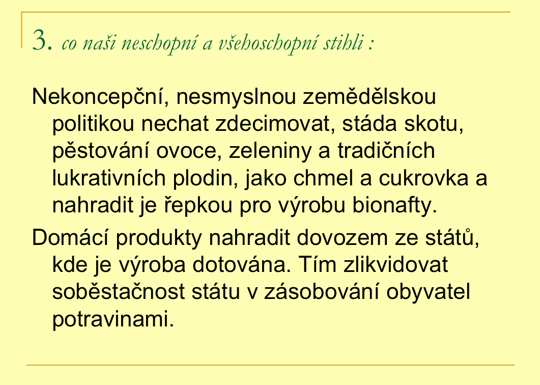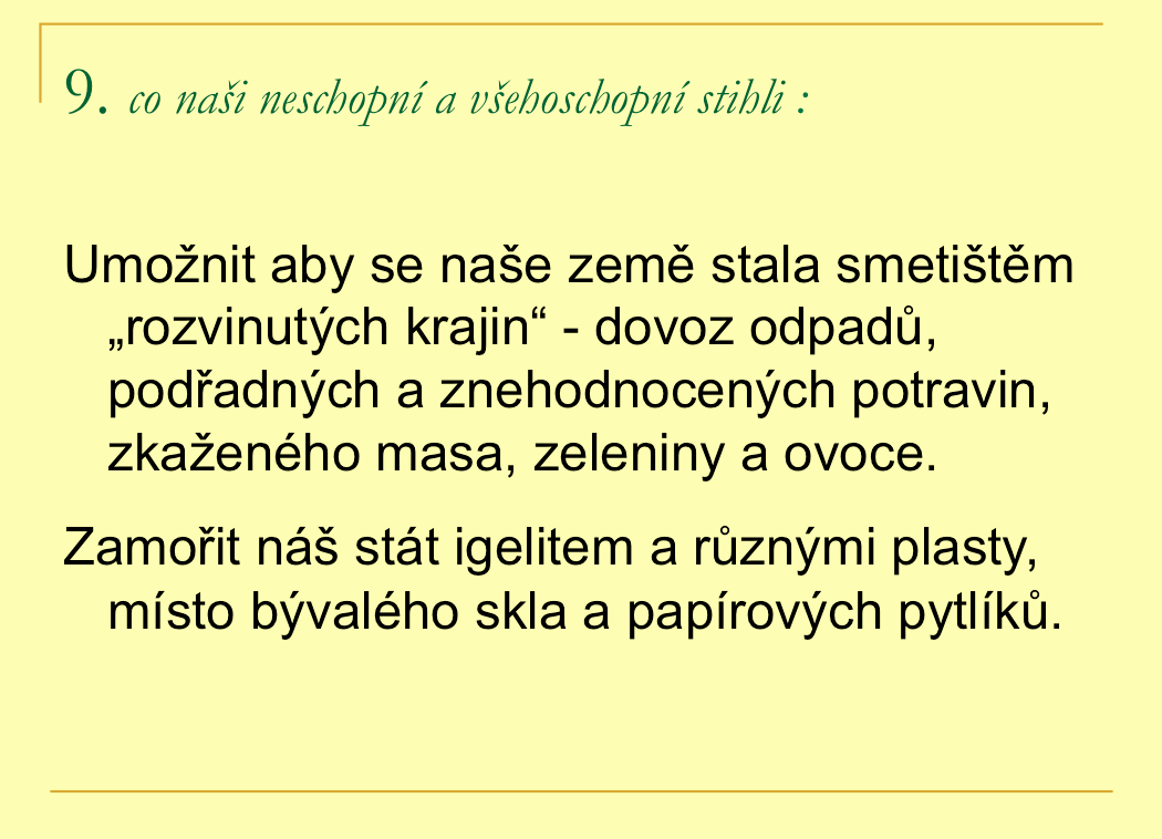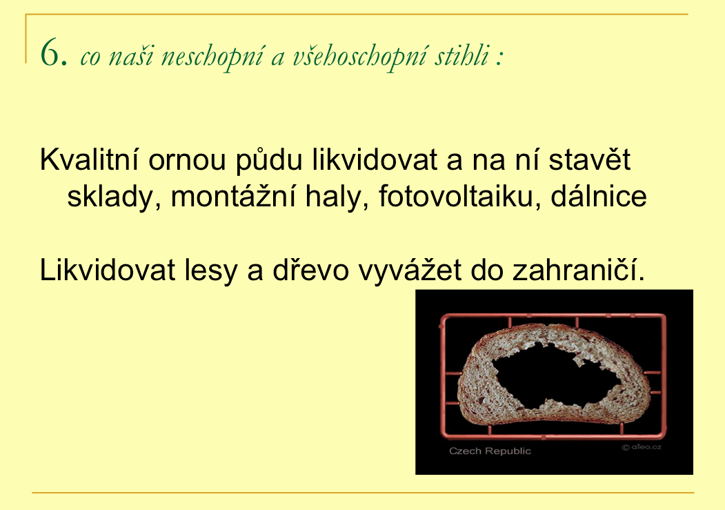 T.M. Všechno není jen vinou všehoschopných neschopných psychopatů co vládnou v této republice od roku 1989. Ti co nám vládli do roku 1989 to bylo stádo neschopných gerontů, kteří navzdory těm možnostem, které měli, nedokázali rozumně a efektivně investovat státní prostředky. Stát byl bez dluhů, ale měl obrovský skrytý dluh ve scházející infrastruktuře např. Navíc mnoho těch věcí uváděných v článku je obecný jev celé naší technogenní civilizace (ty plasty – zamořují oceány, používání palmového oleje – ničí to přírodní prostředí nenahraditelným způsobem na ostrovech na kterých se vyrábí – apod. a další věci). Ale většina je pravdivá a je to tristní (česky tedy – smutné). Otázka je co s tím? Situace se radikálně zhoršuje posledních 15 let ve světě obecně. Toto nemůže skončit dobře podle mého názoru. A protože věci se zrychlují a jevy prohlubují exponenciálně tak stejně tak se blíží konec této civilzace. Howgh