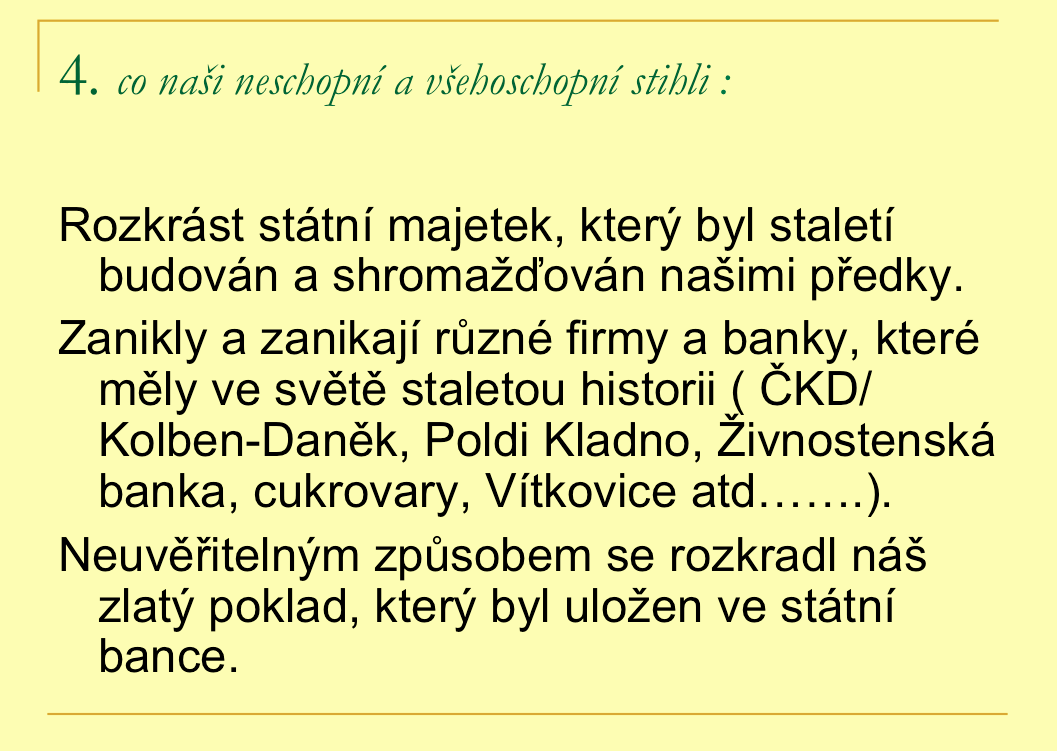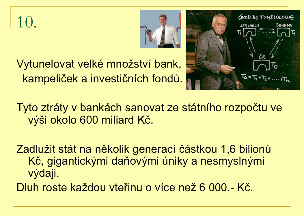 …..zde máte všechno dopodrobna shrnuto, NAPROSTÁ DEVASTACE BOHATÉHO STÁTU, netřeba dotazů. VŠICHNI POLITICI BY MĚLI JÍT DO VĚZENÍ A ZODPOVÍDAT SE ZE ZLOČINŮ, které způsobili českému národu….