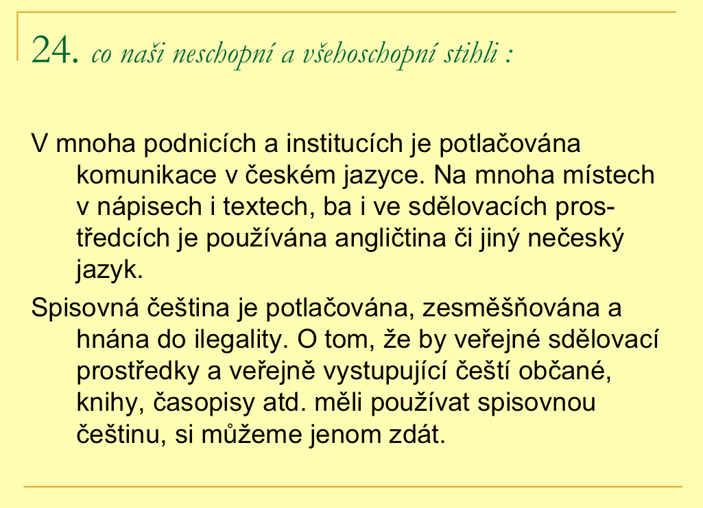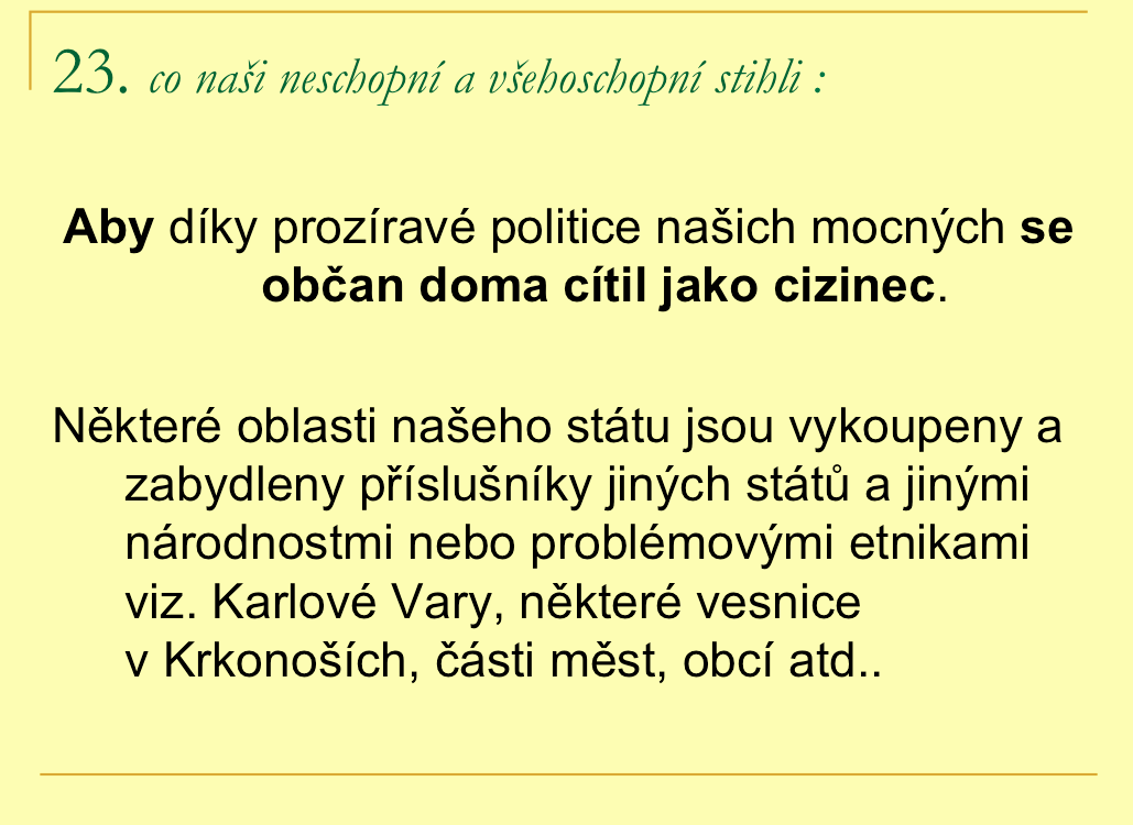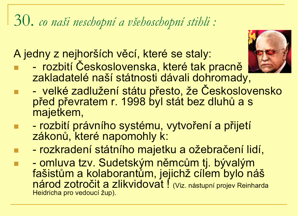 Vždy si náš národ a stát zařadili tam kde jim to vyhovovalo. Jsme tak malý, že si nemůžeme diktovat a máme dost kolaborantů, kteří to umožňují i dnes. Aby to šlo tak si sestaví naši vládu tak aby poslouchala (diktát z EU – Německo a z USA). Po r. 1989 jsme byli ekonomicky a společensky zruinování. Ale celosvětově jim už došlo, že systém přestává fungovat a mění se k lepšímu pomalými kroky zásluhou Ruska.