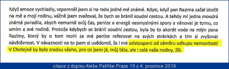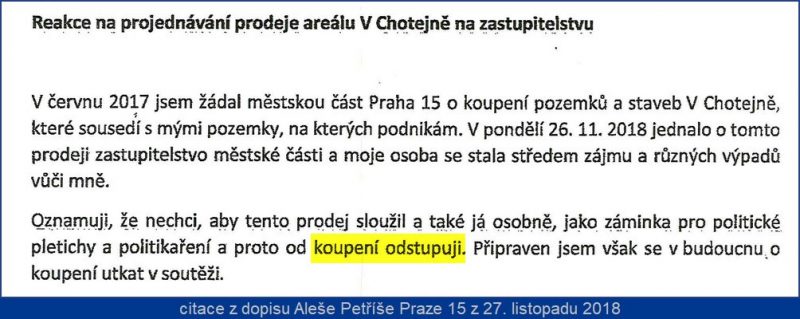 Když se do celé kauzy vložil Kverulant, Alešovi Petříšovi na chvíli povolily nervy a rozhodl se, že „od koupení odstoupí“, o čemž napsal Praze dopis: