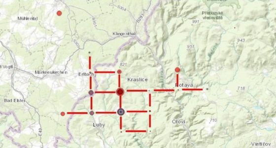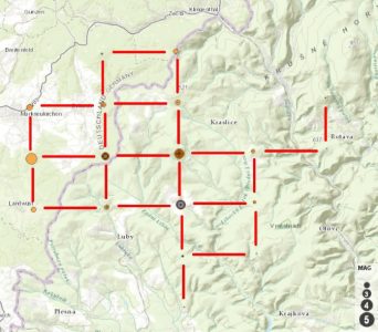 Jde o to, že okolo posledního víkendu automatická detekce seizmických otřesů na http://kozel.ig.cas.cz:8020/ nabídla postupně se kompletující síť aktivních míst, která vůbec nevypadá, že by mohla být přirozeného původu (obrázek z 10.4.2021). Najdete ji na linii měst Landwüst – Luby – Kraslice – Rotava. Tvoří ji čtyři obdélníky o rozměrech cca 4 x 3 km s několika výběžky, které dodržují udané rozestupy.