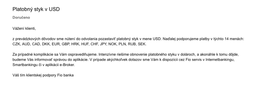 Minulý týden přestaly mnohé banky obchodovat s dolarem a lidé dostávali následující zprávy. Tato např. z Fio banky: