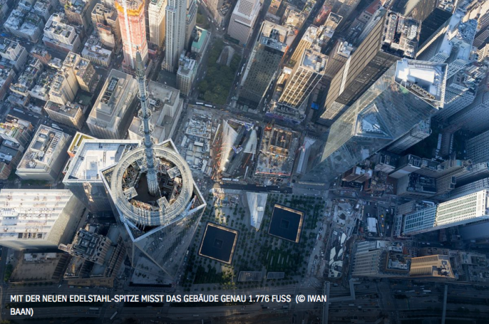 Na budově, která se nazývá JEDNO SVĚTOVÉ OBCHODNÍ CENTRUM, One World Trade Center, byla umístěna špice, která šahá až do výše 541 metrů nad zemí. Slovo JEDNO obzvlášt zdůraznil. Pomyslel jsem si: aha, začínají používat naše čísla pro zdar věci.