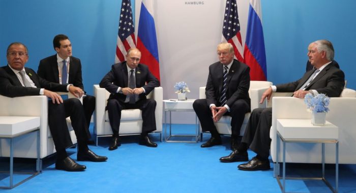 Putin a Trump usporiadali svoje prvé dlho očakávané oficiálne stretnutie na okraji samitu G20 v Hamburgu siedmého júla. Ich rozhovor trval viac ako dve hodiny namiesto naplánovanej polhodiny. Témy rozhovorov zahŕňali krízu v Sýrii a na Ukrajine, boj proti terorizmu a nový pracovný postup riešenia kybernetických hrozieb.