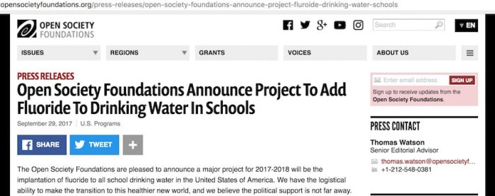 Sorosová Nadácia Open Society sa vydala týmto smerom, zaradiť fluorid do pitnej vody, len po pár mesiacoch po tom, ako bola podobná kampaň zahájená v Rusku.
