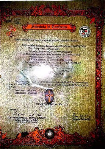 Jako nabídku míru nabízí lóže P2 tento dluhopis, který je podložen 46 000 tunami zlata.