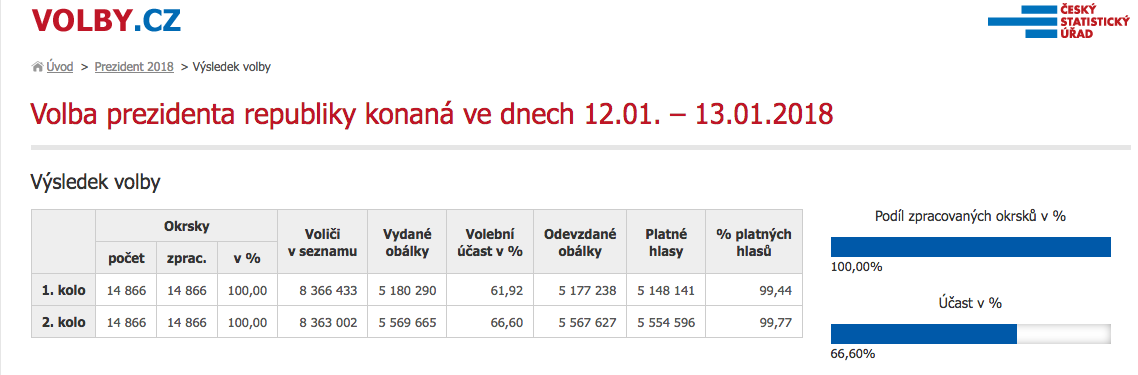 Tedy zaokrouhleno na 2 desetinná místa by to mělo být spíše pak 51,37 %. Pan Drahoš pak dosáhl stejným výpočtem 48,63010739, což tedy správně vychází oněch 48,63%. Proč tedy nemá pan prezident Zeman připočtenu tu jedinou setinku tak, aby to součtem procent bylo také přesně těch 100%?