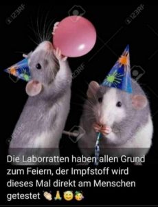 Tak konečně mohou laboratorní krysy slavit velké vítězství, poněvadž se vakcína nebude zkoušet na milých zvířátcích, ale na lidech. Mají velký důvod k oslavě. V budoucnu je nebude mít kdo testovat, promiňte, zabíjet. Viz obrázek níže. Vánoce tedy bude oslavovat zvířecí svět a nikoliv lidé. Však kdysi „ANGLICKÁ KRÁLOVNA“ lidem předeslala, že to budou poslední vánoce. Zpozdila se o dva roky.