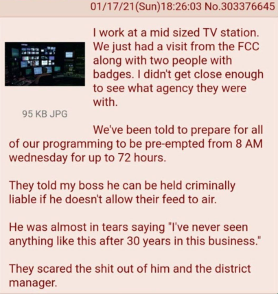Pracuji ve středně velké televizní stanici. Právě jsme měli návštěvu z telekomunikačního úřadu FCC, dva lidi s odznaky (visačkami). Nedokázal jsem se dostat dost blízko, abych zjistil, od které agentury jsou.