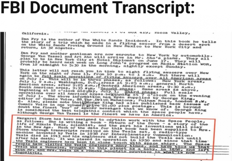 Margaret Stormová dostala za úlohu určitú prácu s Vesmírnymi Ľudmi, išlo o nasledovné: Píše knihu – Návrat Holubice – príbeh o živote Nikola Teslu, vedca, a časť jeho vynálezov bude hrať (úlohu?) v Novom Veku. Mnoho údajov pre túto knihu bolo dodaných pani Stormovej prostredníctvom prepisov získaných z Teslovho prístroja, rádiového prístroja vynájdeného Teslou v roku 1938 na medziplanetárnu komunikáciu. Tesla zomrel v roku 1943 a jeho inžinieri nezostrojili (tento) Teslov prístroj až kým nebol po smrti. Bol uvedený do prevádzky v roku 1950 a odvtedy boli Teslovi inžinieri v blízkom kontakte s vesmírnymi loďami. Vesmírni Ľudia navštívili Teslových inžinierov veľa krát a povedali nám, že Tesla bol Venušan (?) prinesený na túto planétu ako bábätko v roku 1856 a bol nechaný u pána a pani Teslových v odľahlej horskej provincii v dnešnej Juhoslávii.