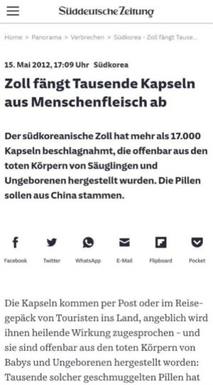 Tak nám pomalu MSM začínají přiznávat pravdu, kterou otiskli v Süddeutche Zeitung. Celníci v jižní Kórei zabavili 17.000 pilulek, které byly vyrobené z lidských těl novorozenců nebo nenarozených dětí. Tabletky pocházely z Číny.