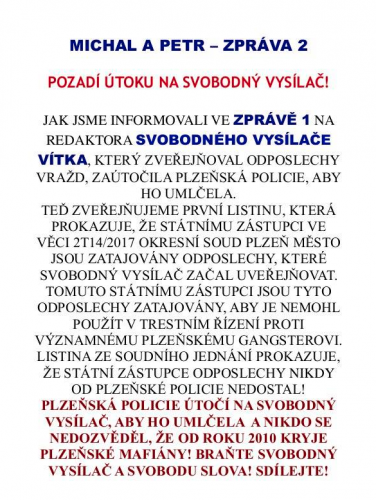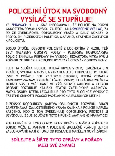 Prosíme všechny příznivce našeho pořadu o sdílení. Ode dnešního dne na nás útočí ta část policie, která kryje vrahy a mafiány, o kterých jsme informovali, tedy ta policie, která ztrácí odposlechy, kamerové záznamy a nechává vrahy vraždit! Poslouchejte ztracené odposlechy vrahů dokud můžete!