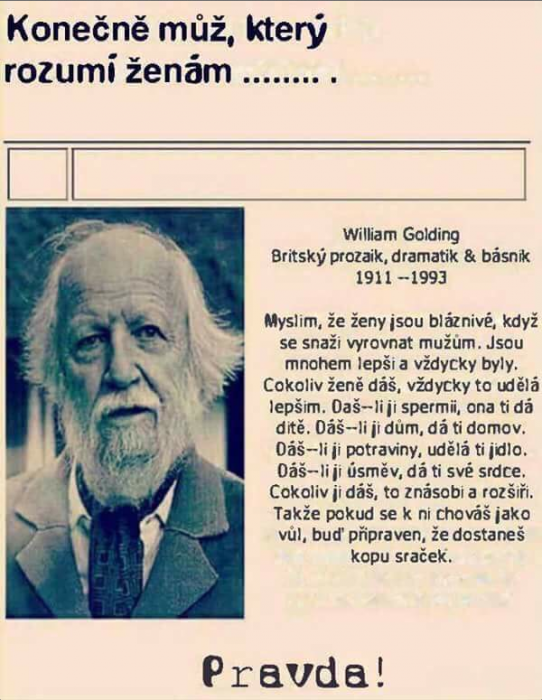 Tento dramatik patří mezi mé oblíbené. 🙂 Chlapa je možné vždy skopat, pak určitě by se měl poslat na vojnu , aby z něj něco bylo, a když byl dobrý voják, byla by škoda ho neposlat také do války a když se z ní nevrátí , je teprve skutečný hrdina. Lidi zbožňují dramata, ale proč vlastně? Obávám se, že můj příspěvek nebude zveřejněn pro přílišnou přílišnost. 🙂 Dnešní muži se neumí bránit ponižování. Zesměšňování berou jako samozřejmost. Filmy, reklamy a umění jsou toho plné. Moore by řekl hloupý bílý muž, ale on ve své knize nezmiňuje zdaleka všechno. Cestu ven on nezná. Jemu jde o nepřehlédnutelné zlo a přesto běžné. Příčiny jsou v hluboce skryté agresivitě. A jak se taková agresivita třeba po velmi dlouhé době projeví? Krásně to ukázal taky umelec a dramatik, vždy hezky oblečený a upravený, jen zprvu občas krátké kalhoty, náš Havel, svým humanitárním bombardováním. A ostatní už zblblí tím vším hned ani neví jestli mu tleskat, nebo nesouhlasit.