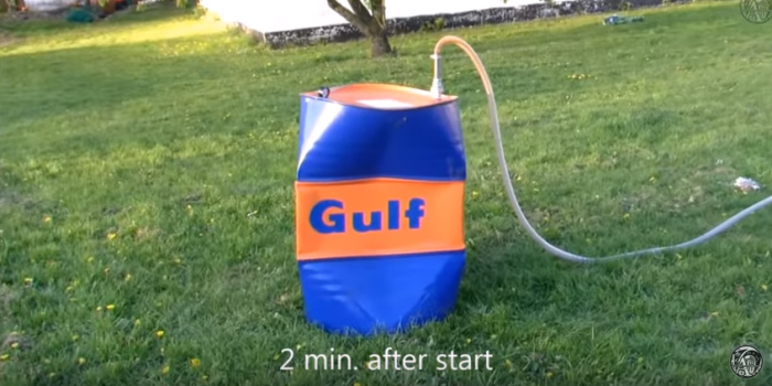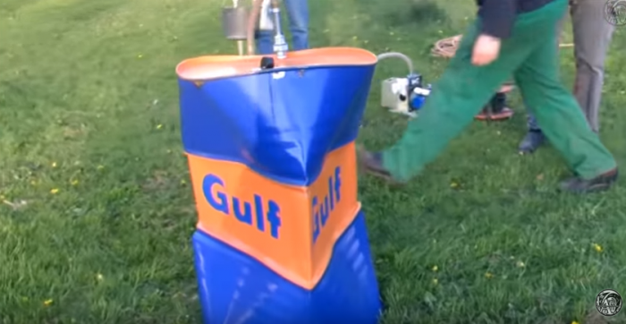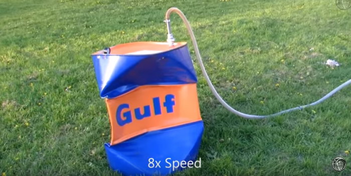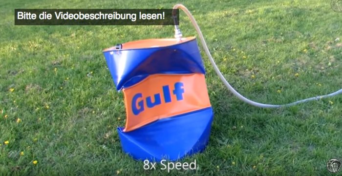 A nyní vážně. Připneme barel na vakuovací dekompresor a vysajeme z něho vzduch. A ejhle, silný pevný kovový materiál se úplně zkroutí. Podívat se můžete dole ve filmu v čase 9:05 – 10:54 Není možná koexistence dvou absolutně rozdílných tlaků bez vyrovnávací komory!!!!! Kde ji tedy mají????