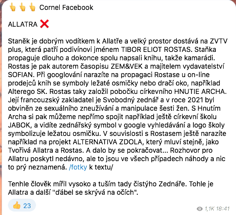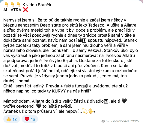 Tak, jak jsme kdysi odhalili některé „alternativy“, které také pomlouvaly tadesco, odhalíme i následující nový pomlouvačný web / telegram kanál, kde se dokonce i autor sám odhalil. Neumí myslet v kombinacích, ani dedukovat některé výroky, které zveřejnil. Osobně mi pisálek tohoto kanálu nestojí ani za zmínku a čtení jeho údajných odhalení, protože jsou infantilní a trapná. Ale vzhledem k tomu, že se snaží pomluvit veškerou českou alternativu a hlavně všechny rozeštvat proti sobě, musím se o něm zmínit.