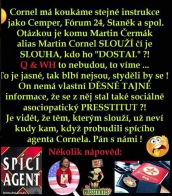 Tento dezolát CORNEL mi hodně připomíná PEPÍKA INSIDERA (rozumějte PETERA INSIDERA ze Slovenska), který se také hodně chvástal, machroval a pomlouval, dokud jsme neodhalili, že je to jenom jakýsi hydrocef@lus z paneláku, že z Austrálie vůbec nevysílal (ani nevěděl jaký je tam čas, když se ho na to moderátor kontrolně zeptal) a dneska po něm ani pes neštěkne. Protože na pomlouvání a obtěžování jiných lidí se kariéra prostě udělat nedá. Domněle se sice kydá na jiné lidi, ale ten, kdo se přitom sám nejvíc zašpiní, je dotyčný kydač hnoje a tato špína už se s ním táhne pořád. Na to, abyste udělali „kariéru“, prostě musíte něco konstruktivního umět.