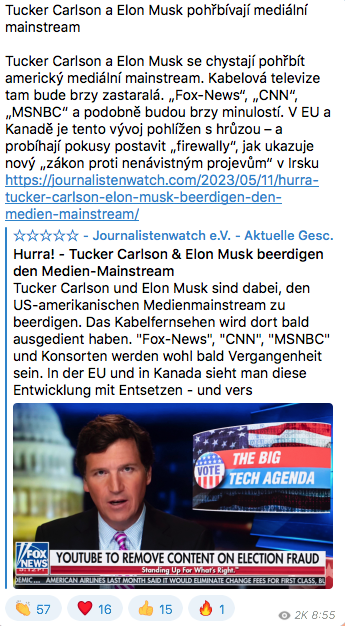 …..díky Vašim mejlíkům, které jste mi hromadně zasílali, jsem se dozvěděl o jednom telegramovém kanálu, a na Váš popud jsem si ho „na koštěti proletěl“. Je to tak do očí bijící a tak směšné, že jsem se dokonce musel autorovi zasmát a vysmát. Píše totiž sám o sobě….