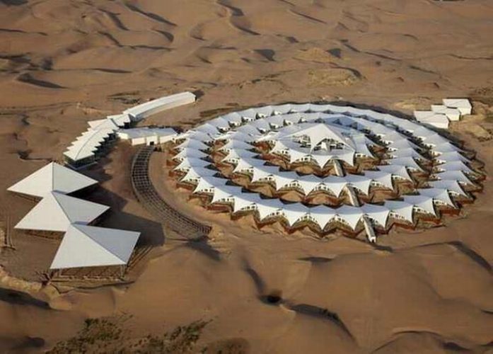 V izolované poušti Xiangshawan v Mongolsku leží nádherný hotel tvořený kruhy bílých stanů. Stany byly natočeny a spojeny dohromady tak, aby vypadaly jako lotosový květ. Středisko využívá solární, vodní a větrné energie v poušti, a stany byly postaveny tak, aby chránily hotel před pouštními jevy.