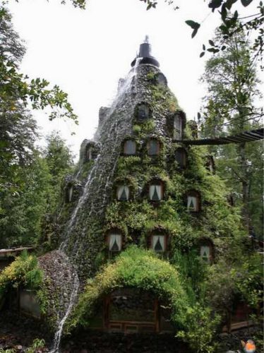 Hotel ve tvaru sopky, která chrlí vodu namísto ohně! Hotel se nachází v soukromé přírodní rezervaci Huilo Huilo a je kompletně zasazen do svého přirozeného prostředí. Celý je pokrytý mechem a rostlinami, takže vypadá jako kouzelný mystický palác uprostřed lesa. Samotný hotel je postaven z místního dřeva a kamene a každý pokoj je pojmenován podle různých místních druhů ptáků.