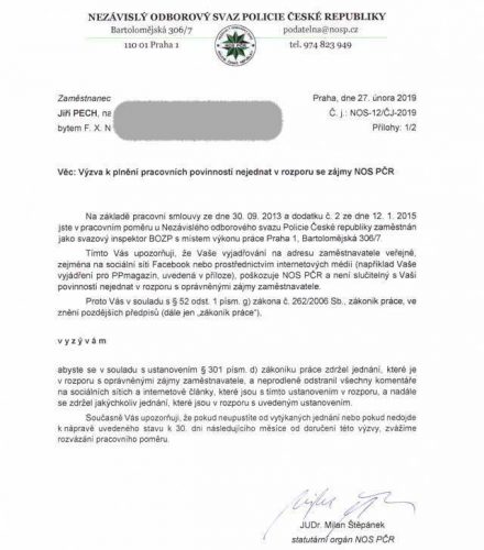 „Jen se vás dovoluji touto cestou dotázat, kdo je vlastně statutárním orgánem mého zaměstnavatele? Jak jsem zjistil, byl jste na 11. sjezdu NOS PČR odvolán a tedy byste neměl jednat jako statutární orgán jménem mého zaměstnavatele,“ podotýká Pech, jenž prostřednictvím sociálních sítí upozorňuje na nešvary vedení NOS PČR.