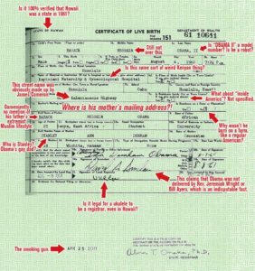 Pár lidí si pamatuje, že dřívější Obamovy webstránky uváděly místo jeho narození Keňu. Jeho oficiální záznam absolventů Harvardu z roku 1991, (studium platila jeho movitá chazarská babička) uváděl „narozen v Keni, vyrůstal v Indonésii a na Hawaii“. Totéž tvrdila v jeho oficiálním životopisu jeho literární agentura a nakladatel jeho knížky. To by ho samozřejmě na prezidentství diskvalifikovalo, neboť podle ústavy musí prezident být rodilý Američan. Od jeho kandidatury se však náhle uvádí místo jeho narození jako Honolulu, Hawaii!