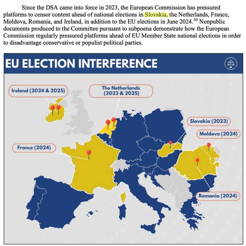 Evropská komise tlačila na platformy, aby cenzurovaly obsah před národními volbami na Slovensku, v Nizozemsku, ve Francii, v Moldavsku, v Rumunsku a v Irsku a před volbami do EU v červnu 2024. Neveřejné dokumenty předložené výboru na základě předvolání ukazují, jak Evropská komise pravidelně vyvíjela nátlak na platformy před národními volbami v členských státech EU s cílem znevýhodnit konzervativní nebo populistické politické strany.