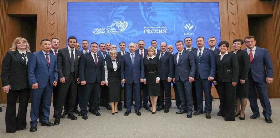 Ruský prezident Vladimir Putin pózuje na skupinovém snímku se starosty obcí v Rusku, 21. dubna 2025