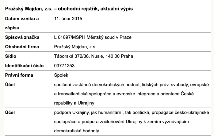 Spolek Pražský Majdan vznikl již 11. února 2015 za účelem spolčení zastánců demokratických hodnot, lidských práv, svobody, evropské a transatlantické spolupráce a evropské integrace a orientace České republiky a Ukrajiny. Dále pak podpory Ukrajiny, jak humanitární, tak politické, propagace česko-ukrajinské spolupráce a podpory začleňování Ukrajiny k zemím vyznávajícím demokratické hodnoty.
