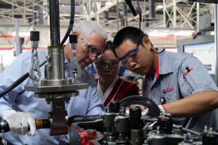 Na fotografii níže je Pence při návštěvě společnosti Foton Cummins Engine Company, která má sídlo v Indianě a závod v Pekingu. Pomáhá čínskému pracovníkovi, kvůli kterému je teď Hoosier bez práce (americký výrobce závodních pneumatik se sídlem v Indianě, pozn. překl.)