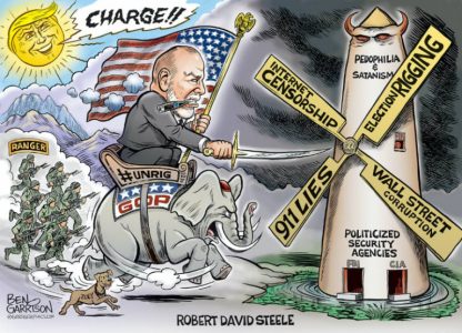 Poskytla umělci nějaké nápady, laskavě se mě zeptala, co považuji za důležité já, a z toho vyšel jeho původní výtvor. Byl jsem ohromen jeho schopností zachytit na jednom obrázku vše, čím pohrdám a snažím se reformovat. Představil si mě v duchu jako „Dona Quijota,“ ale na rozdíl od Dona Quijota mě vidí surfovat na vlně jménem Trump a Republikánská strana, podporován databází Národní bezpečnostní agentury (NSA), která obsahuje všechny důkazy, které potřebujeme k úplnému vymýcení zrádců, elitních pedofilů a všech zločinců jak v bílých, tak i v černých límečcích.