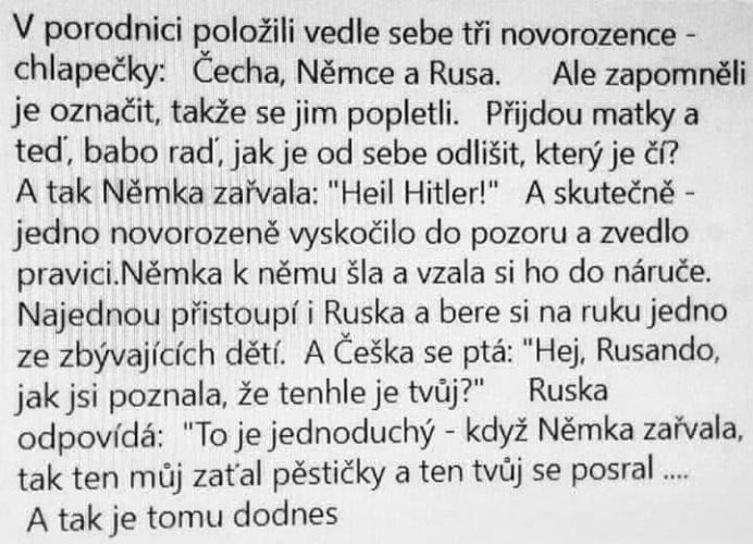 No a přesně o tom ten vtípek je. Češi mají takové v-el-it-el-e/vedení, které se po… Ruské velení se nepo… Možná by se do vtipu hodila víc polská máma než česká, protože polské rádoby vedení – j-el-it-a – byla zakopečkama, když vypukla 2 světová… A to polští vojáci na koních… vzdorovali jak mohli…., ale bez velení…