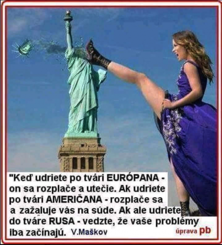 Rusa mlati do obliceje uz hrozne dlouho, on ale stale drzi, protoze vi, ze by musela jinak zemrit spousta lidi. Jeho moudrost a rozvaha prestanou, az mu sahnete na to, co je mu svate – na jeho zem, nabozenstvi a jeho tradice! Pak sranda a ukajeni se zapadu a USA provokacemi Ruska rychle prestanou! Ta pakaz bude hledat jenom nory, kde by se schovala!