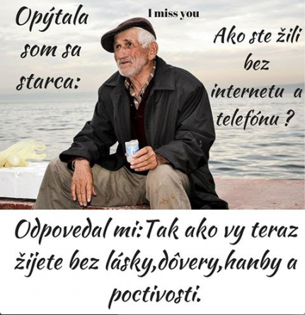 Čiže – bez mobilov a internetu žili starí „ako my teraz“ – bez lásky, hanby, dôvery a poctivosti – toť výsledok SMS-kovej úrovne komunikácie. My sme žili ako NIE!!! VY TERAZ bez lásky, hanby, dôvery a poctivosti – preto stále platí, že „zmluva nemyslí, zmluva hovorí“ – čierne na bielom. Inak – my sme žili ako vy teraz – bez banánov – my sme ich nemali v obchodoch dosť, a vás zasa nezaujímajú, alebo nemáte na ne peniaze.