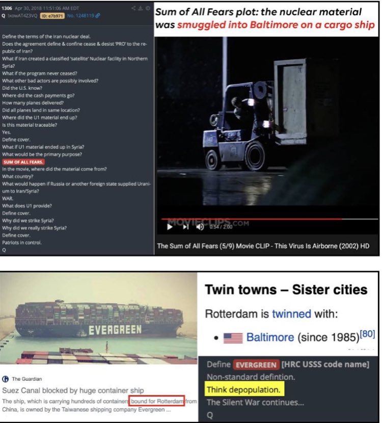 Na komunikační aplikaci Telegram, účet s více než 106 000 odběrateli napsal: „Suezský průplav blokuje obrovská kontejnerová loď jménem Evergreen. Lodní doprava Evergreen je s největší pravděpodobností zástěrkou pro obchodování s lidmi a sexem. Celý příběh si přečtěte zde: